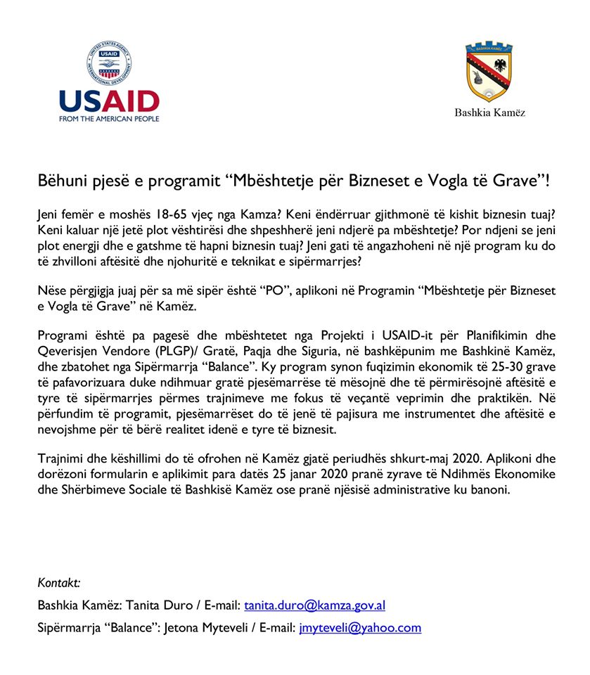 Një mundesi e artë iu ofrohet grave në territorin e Bashkisë Kamëz për të bërë biznes. Veç lehtësirave të Bashkisë për këtë shtresë të shoqërisë përmes paketës fiskale kaluar në dhjetor të vitit të kaluar në Këshillin Bashkiak si dhe të rinjve, një projekt i përbashkët i Bashkisë Kamëz dhe USAID/Albania fton të gjitha femrat e moshës 18-65 vjeç të bëhen pjesë e programit “Mbështetje për Bizneset e Vogla të Grave”!