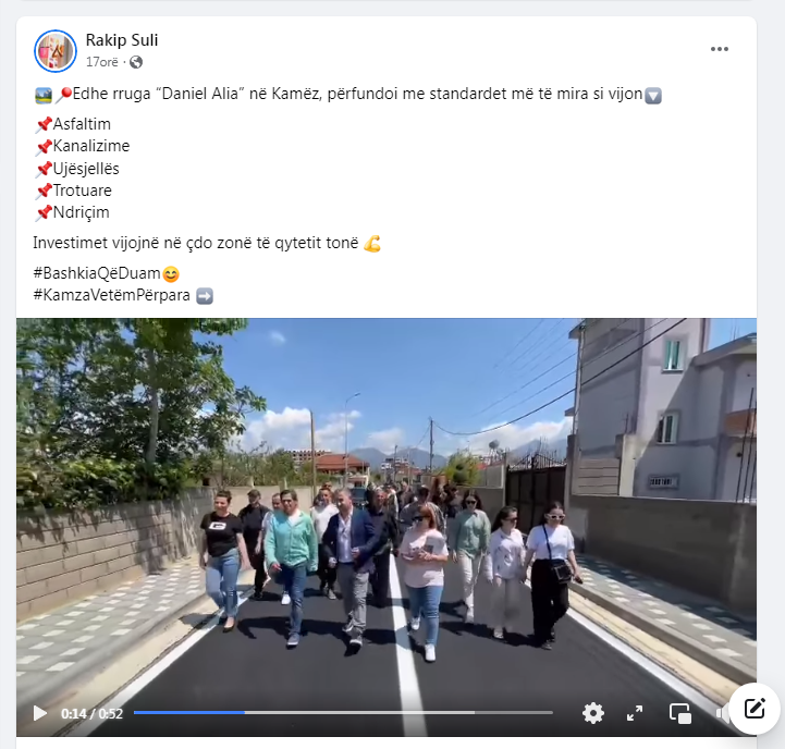 Përfundon edhe rruga “Daniel Alia” në Kamëz. Investim me standardet më të mira! Postuar Më : 21-06-2023 Edhe rruga “Daniel Alia” në Kamëz, përfundoi me standardet më të mira si vijon Asfaltim Kanalizime Ujësjellës Trotuare Ndriçim Investimet vijojnë në çdo zonë të qytetit tonë #BashkiaQëDuam #KamzaVetëmPërpara