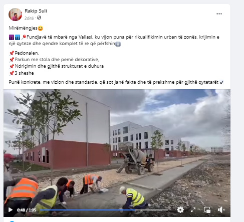 Vijon puna për rikualifikimin urban të Valiasit Postuar Më : 11-03-2023 Mirëmëngjes Fundjavë të mbarë nga Valiasi, ku vijon puna për rikualifikimin urban të zonës, krijimin e një qyteze dhe qendre komplet të re që përfshin Pedonalen, Parkun me stola dhe pemë dekorative, Ndriçimin dhe gjithë strukturat e duhura 3 sheshe Punë konkrete, me vizion dhe standarde, që sot janë fakte dhe të prekshme për gjithë qytetarët